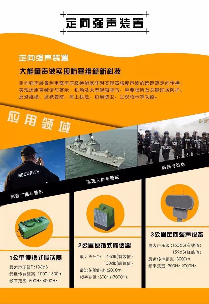 研發了定向強聲裝置、“驅逐者”聲波驅離裝備等適用于軍事、民用的主動安防系統,為國家、為社會提供了新型高科技安防手段,為提高全民安全感建設提供了技術支持;