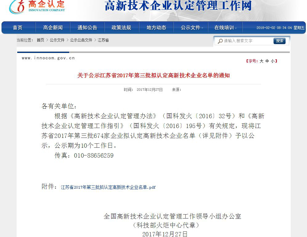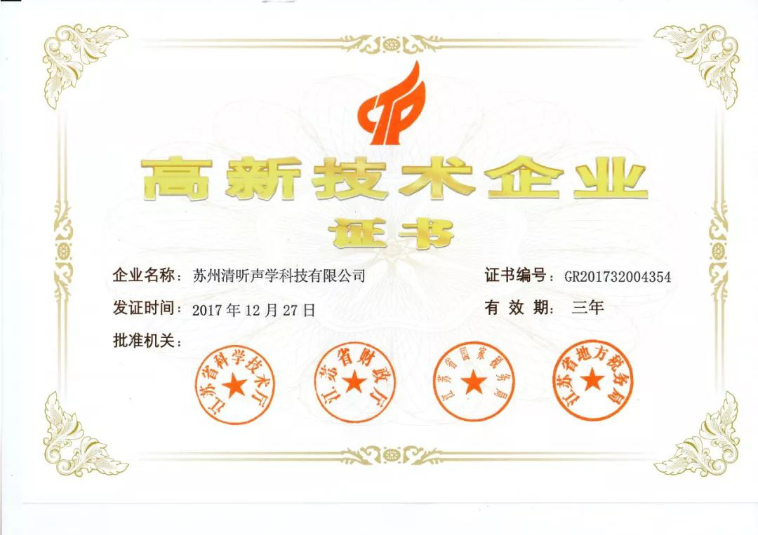 2017年12月27日,高企認定官網上公示了江蘇省第三批擬認定高新技術企業名單,清聽聲學榜上有名。
