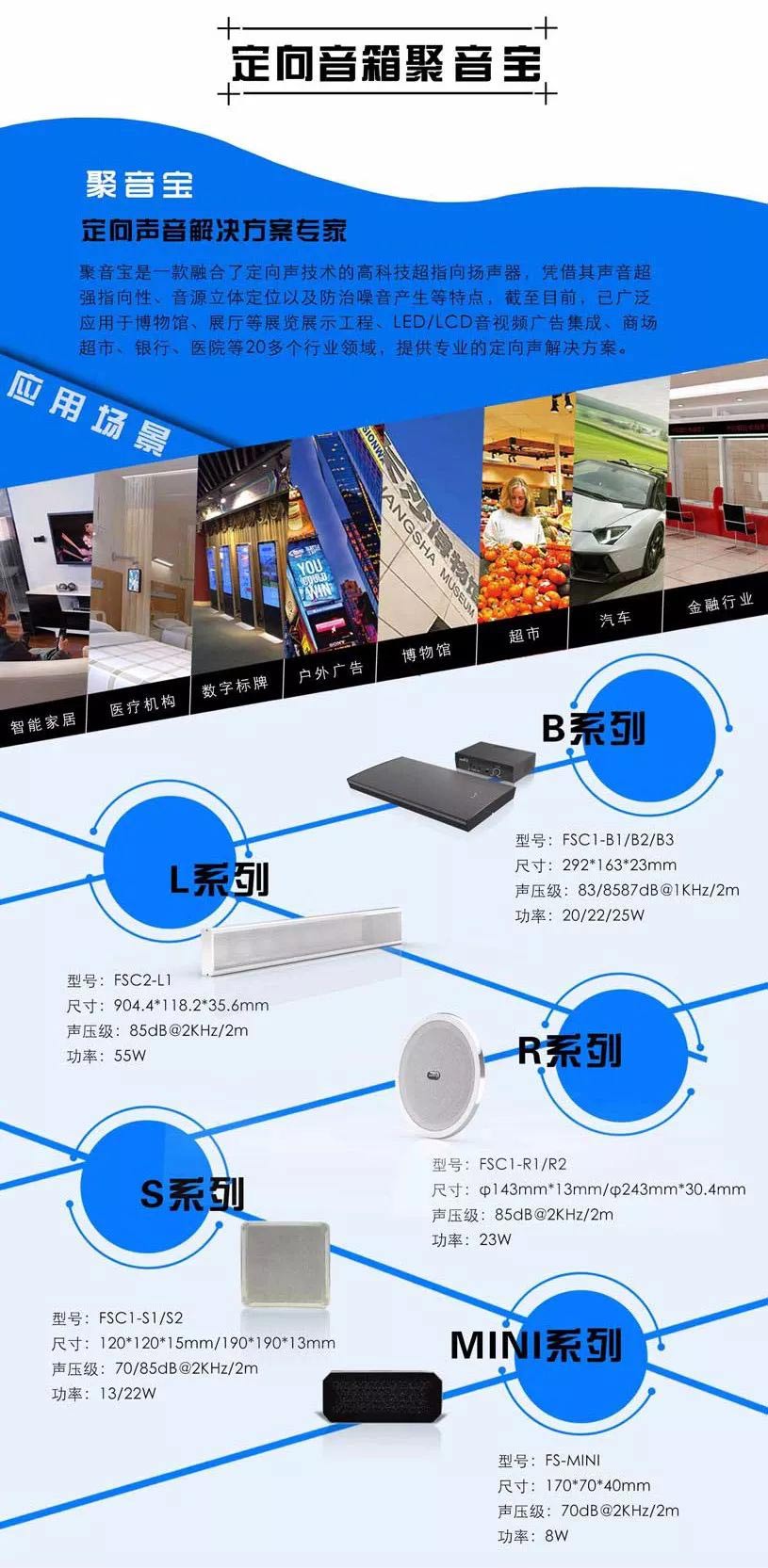 兩年時間,聚音寶從中國走到了韓國,荷蘭,美國,從博物館、規劃館走到了企業展廳、機場、景區、圖書館、百貨商場...截至目前,聚音寶的定向聲音解決方案廣泛應用于文化科博、企業展廳、LED/LCD互動傳媒、汽車、智能交通、商場商超、銀行、醫療教育等20多個行業。